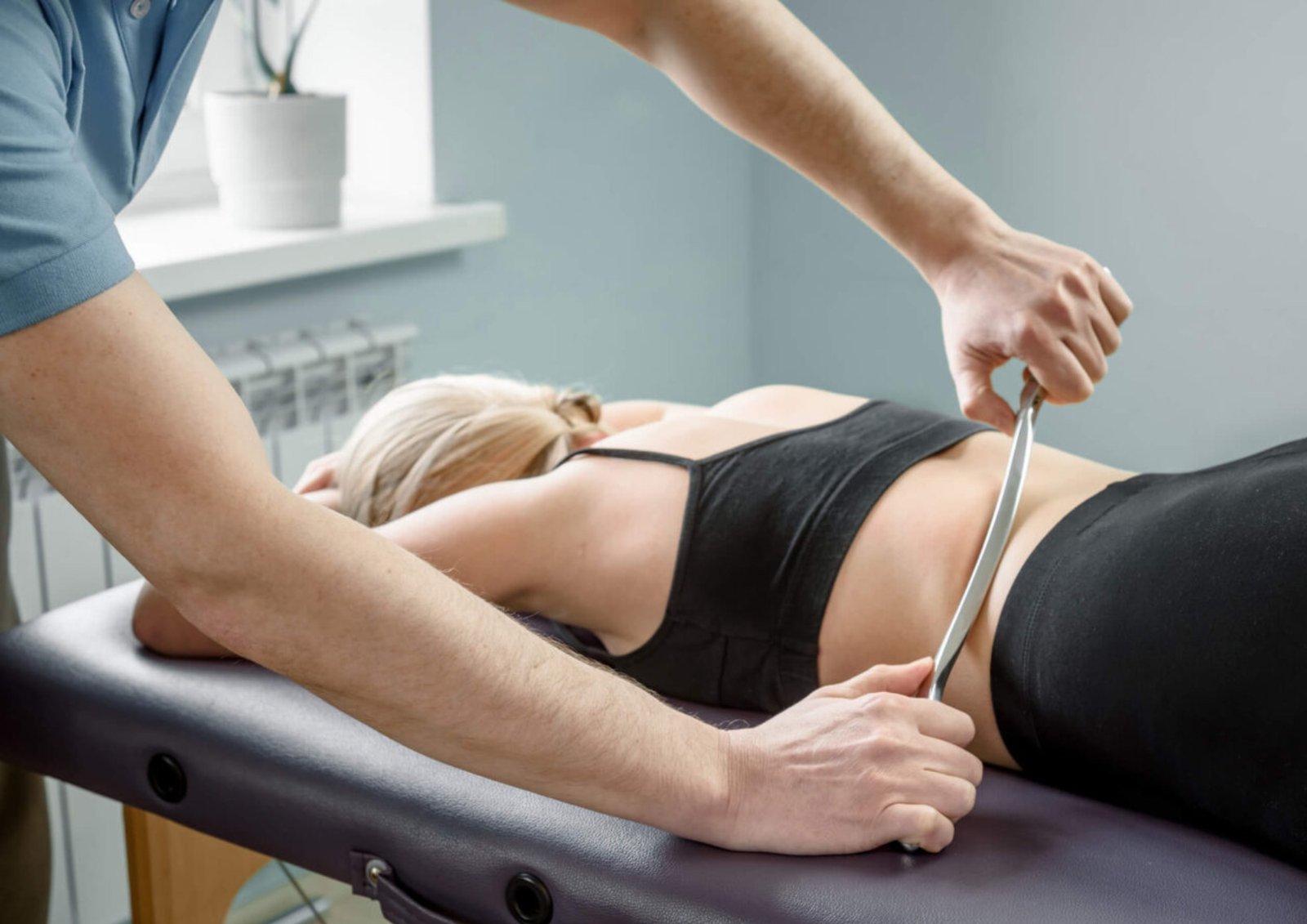 Specialized tools are used to break down scar tissue and fascial restrictions. It’s highly effective for post-injury muscle tightness and sports-related strain.